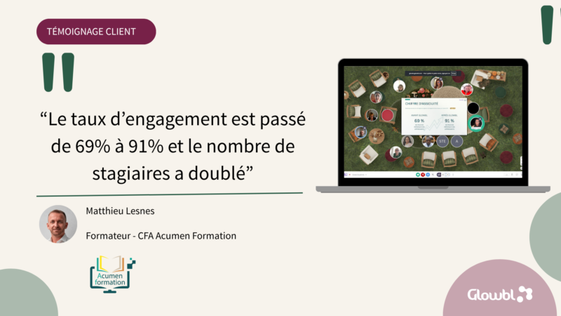 « Glowbl ne se limite pas à la pédagogie. Chez Acumen Formation, nous l’avons également déployé pour nos activités commerciales et de recrutement ». La plateforme a été aménagée en un véritable « showroom virtuel ».